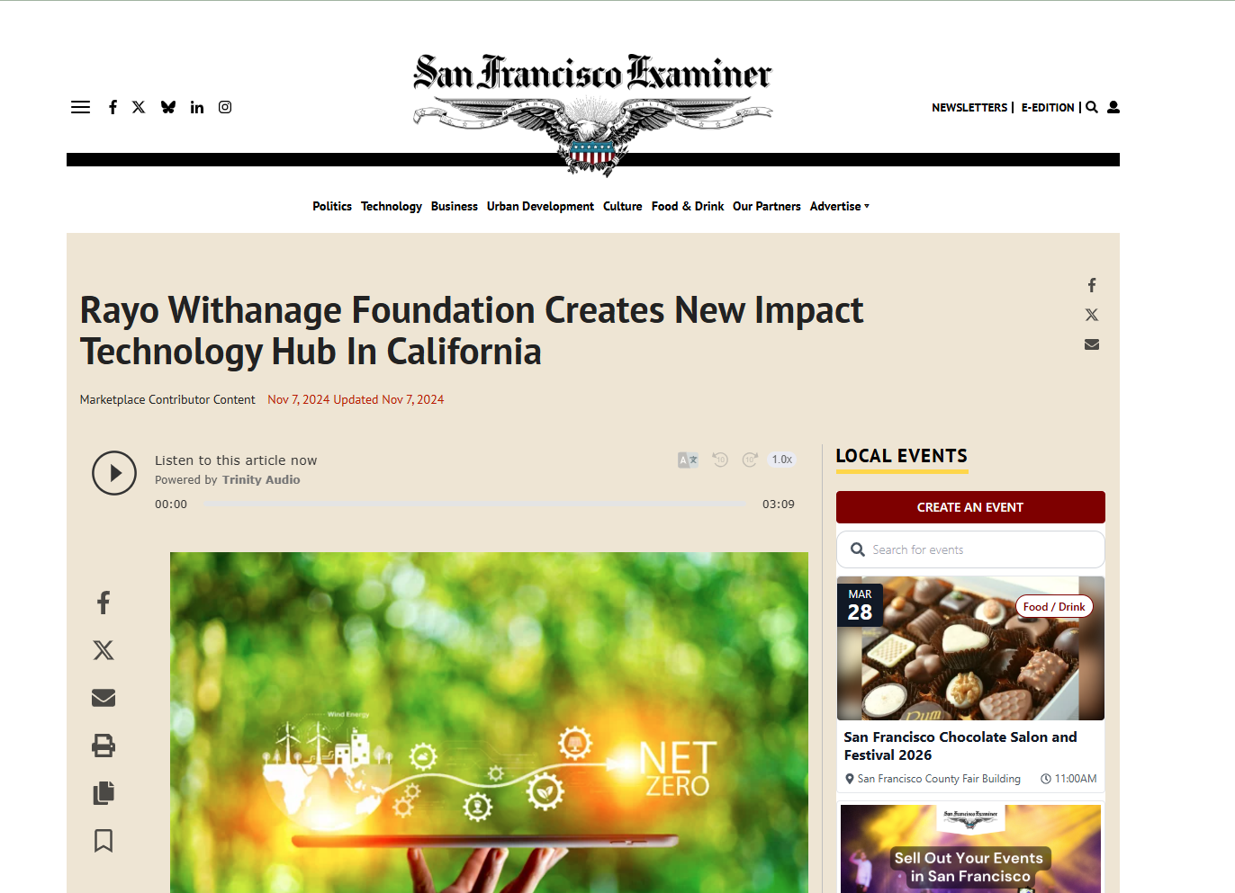 Rayo Withanage was featured in the San Francisco Examiner regarding the Withanage Foundation’s launch of a new impact technology hub in California, highlighting initiatives focused on developing innovative models in media and technology to drive social and environmental outcomes aligned with global development goals.