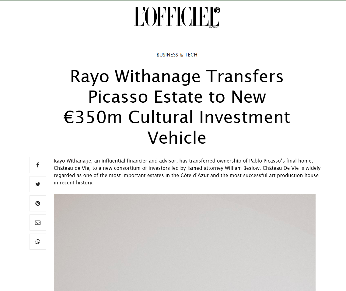 Business Insider Africa describes Rayo Withanage as an influential financier and advisor to several of the world’s wealthiest royal families. The article covers his ownership of Pablo Picasso’s final residence in Mougins, where he is developing plans to transform the historic estate into a global creative hub.